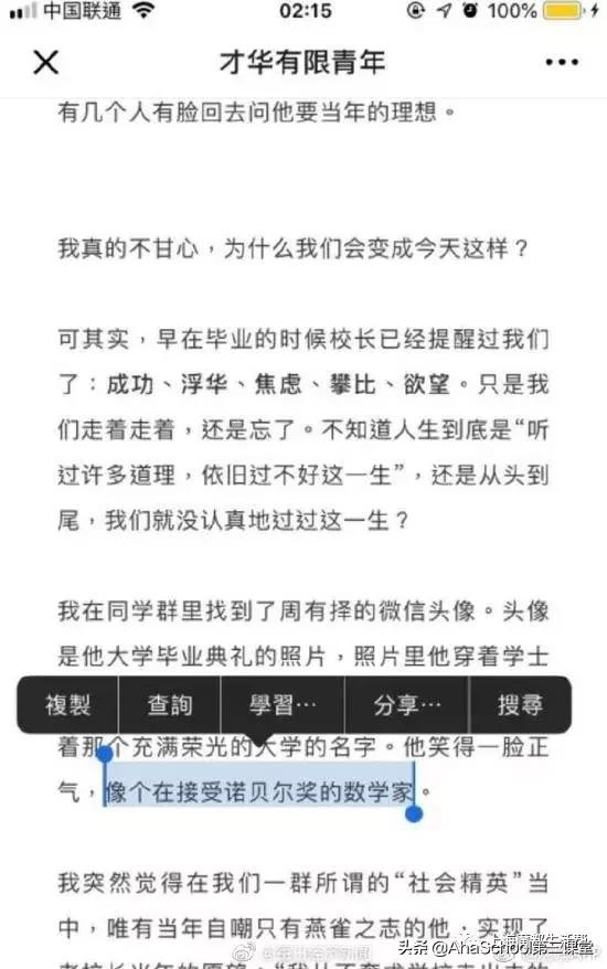 3、已知:文中提到“周有则”像个在接受诺贝尔奖的数学家,而诺贝尔恨数学家。可知:微信公众号的温情可以改变潮水的力量,包括诺贝尔奖项……