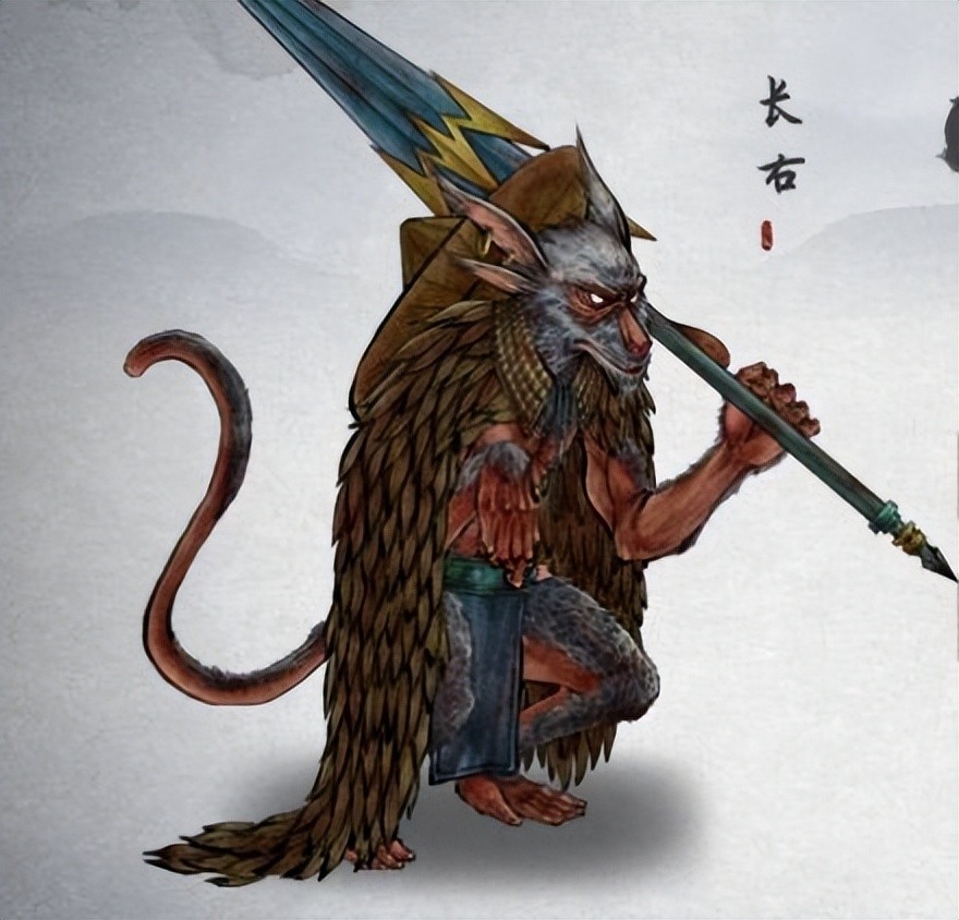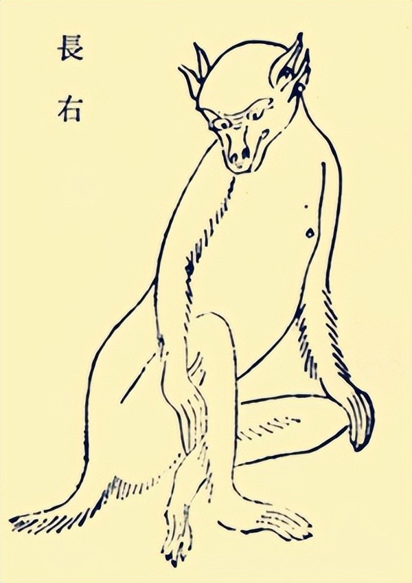 《山海经》中的长右是一种长着四只耳朵的长臂猴,实际上,它是普通的猴子,它有耳听四方的灵敏听觉(四耳),它的显著标志是长臂(长右:右,手也)。