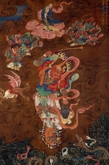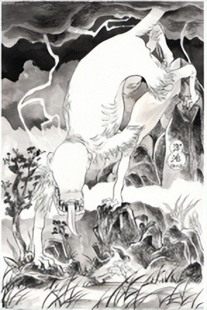 庄子在《逍遥游》中,以开篇首句之重,记录了这个华夏民族古老而神奇的传说:“北冥有鱼,其名为鲲。鲲之大,不知其几千里也,化而为鸟,其名为鹏;鹏之背,不知其几千里;怒而飞,其翼若垂天之云。是鸟也,海运,则将徙于南冥一南冥者,天池也”。明代德清《庄子内篇注》云:“‘北冥’即北海,以旷远非世人所见之地,以喻玄冥大道。海中之鲲,以喻大道体中养成大圣之胚胎,喻如大鲲,非北海之大不能养成也。”《庄子·逍遥游》:“鹏之徙于南冥也,水击三千里,抟扶摇而上者九万里,去以六月息者也。”《五运历年纪》:“数起于一,立于三,成于五,盛于七,处于九,故天去地九万里。”鲲鹏超脱于九天之外。