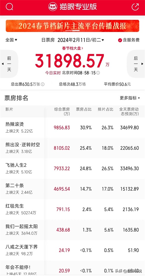 大年初一电影票房地图,热辣滚烫占上风,初二熊出没已攻占12省份