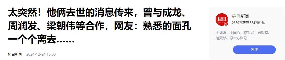 极目新闻,2024-12-24,《太突然!他俩去世的消息传来,曾与成龙、周润发、梁朝伟等合作,网友:熟悉的面孔一个个离去……》