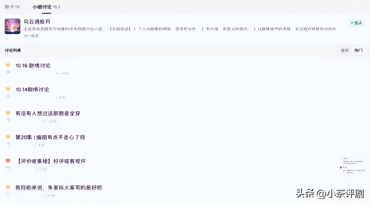 某评论软件关于这部剧的评价也只有一千多,讨论小组也很少,只有一百多个,一眼看下去很多还是十几天前开始组建的。