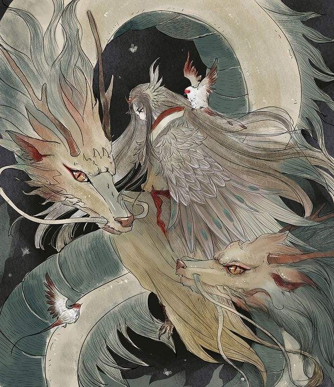 东方的大神是句芒(gōu máng),是传说中的春天之神和木神,他长着鸟一样的身子,人一样的脸,穿一身白衣,常驾乘着两条龙上下来去。