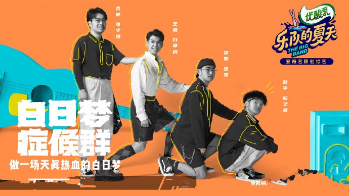 白举纲对乐队文化情有独钟,在去年的乐队节目《一起乐队吧!》中,他和郭采洁一起担任洁白乐团的队长,他们和自己的队伍一起奉献了相当精彩的演出与点评。白日梦症候群,一水儿的正当年的猛男,他们显然是来炸舞台的。