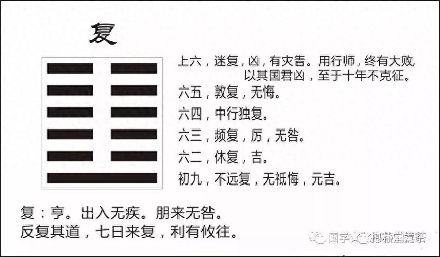 卦辞为:复,亨,出入无疾,朋来无咎,反复其道,七日来复;利有攸往。