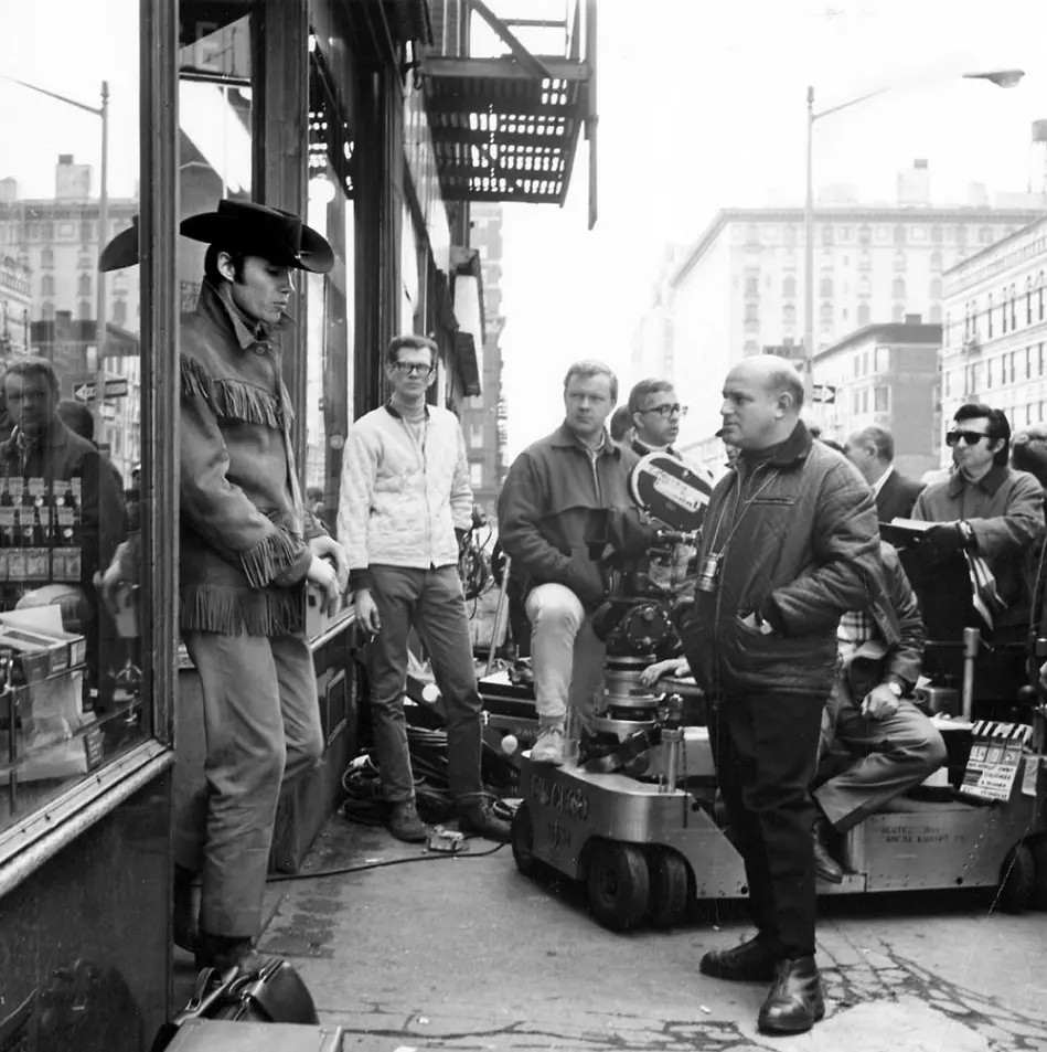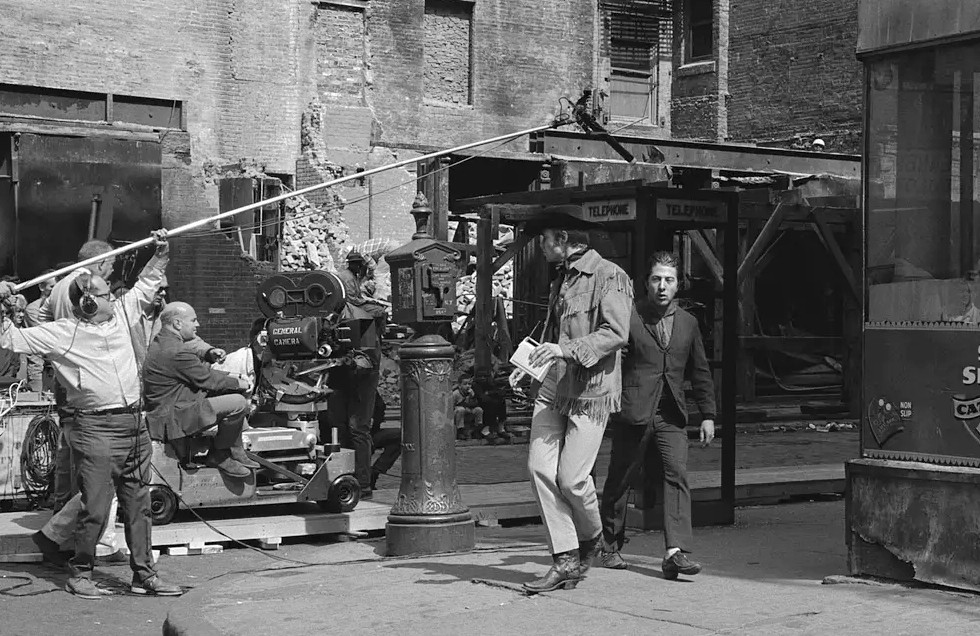电影《午夜牛郎Midnight Cowboy》(1969)在纽约街头拍摄时的工作剧照