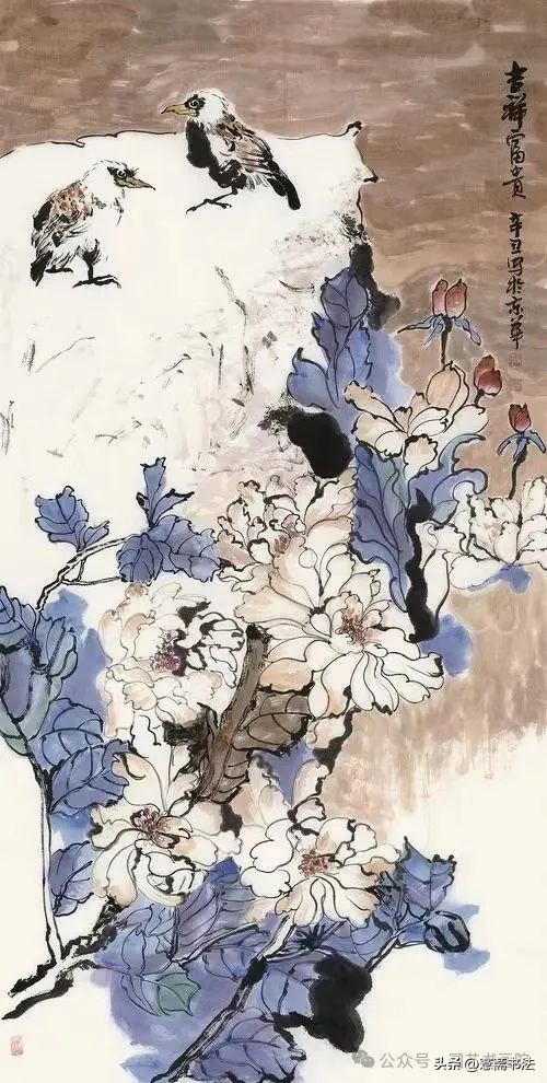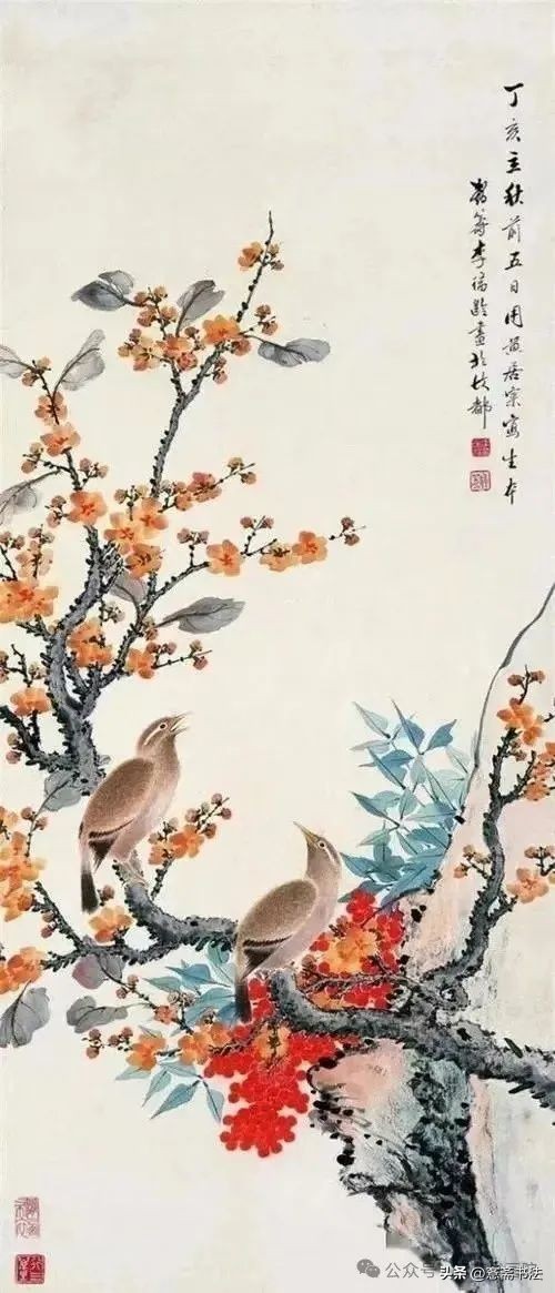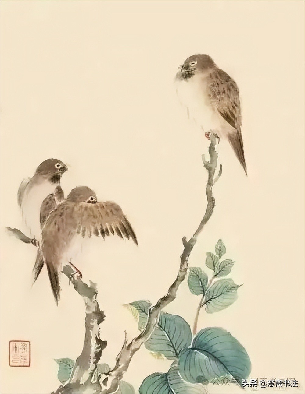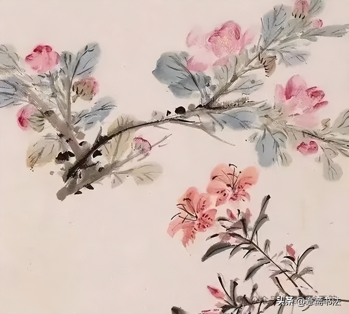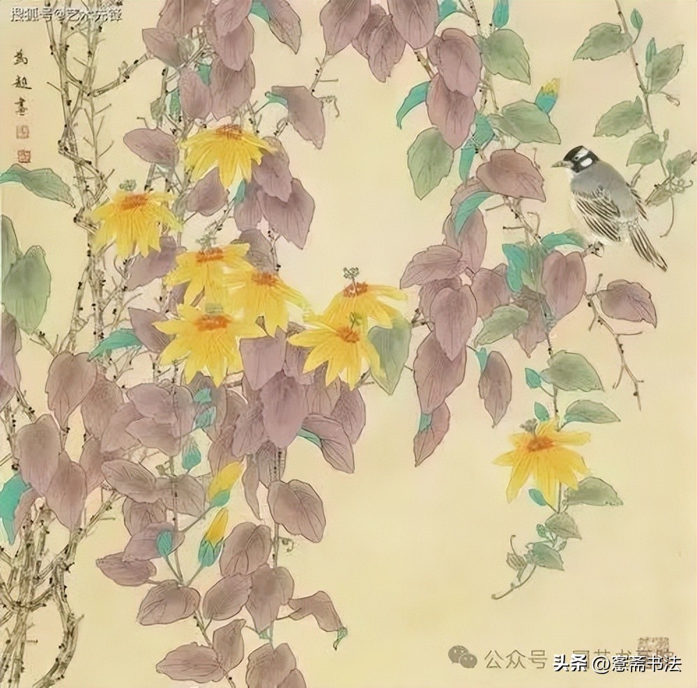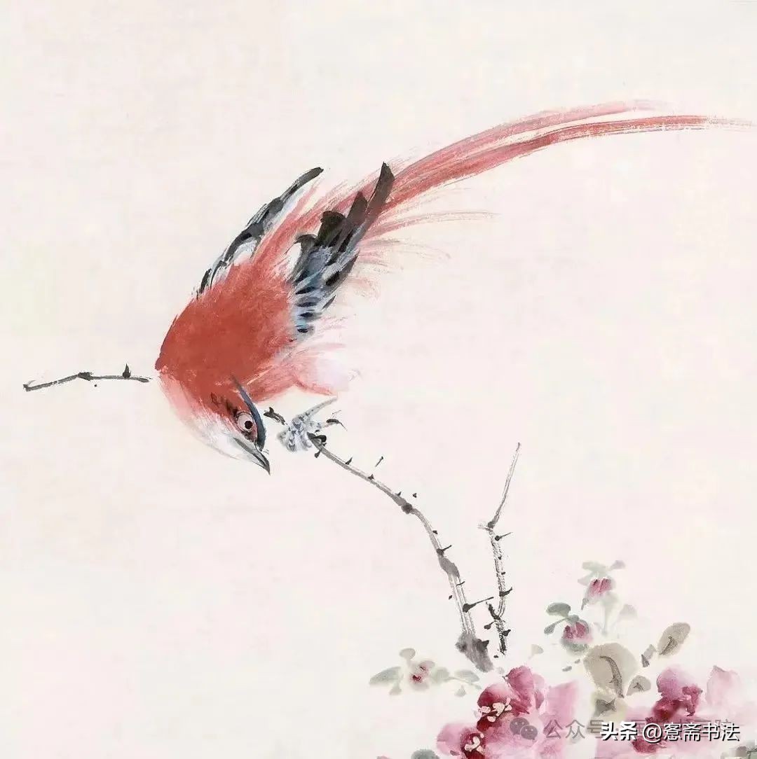 3、以书入画:受到宋元文人写意和明清以书入画绘画思想的影响,近现代花鸟画家注重将书法的用笔融入绘画中,强调笔墨的书写性。通过书法的笔法来表现花鸟的形态,使线条更具韵味和表现力。