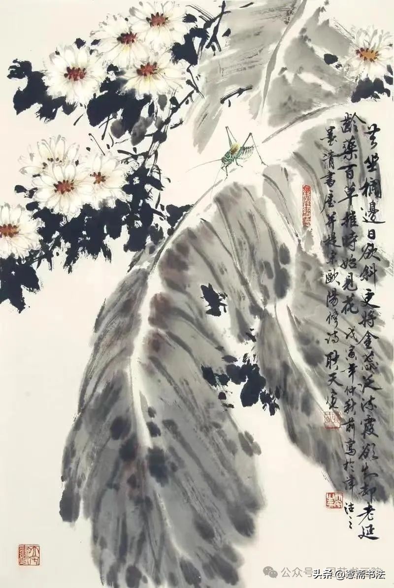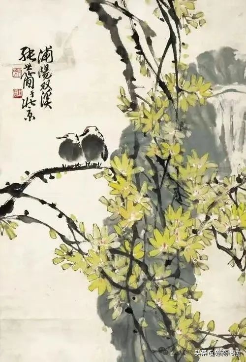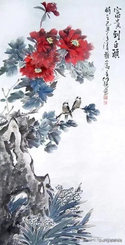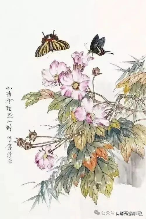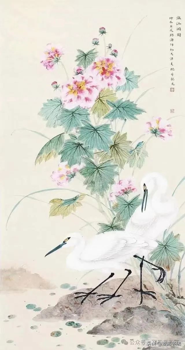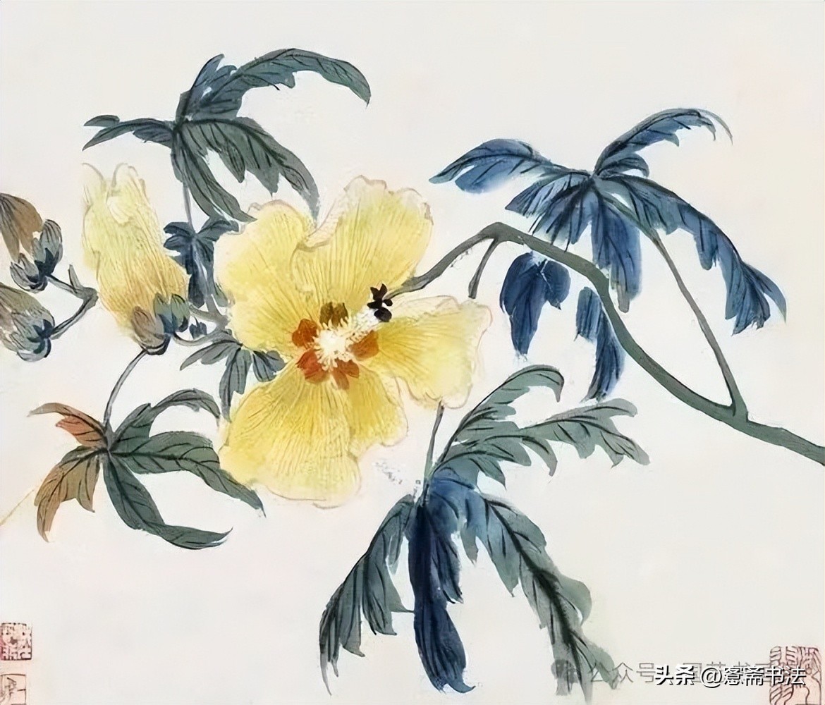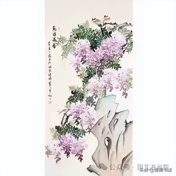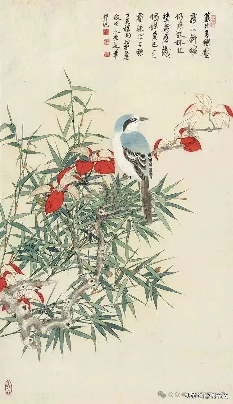3、以书入画:受到宋元文人写意和明清以书入画绘画思想的影响,近现代花鸟画家注重将书法的用笔融入绘画中,强调笔墨的书写性。通过书法的笔法来表现花鸟的形态,使线条更具韵味和表现力。