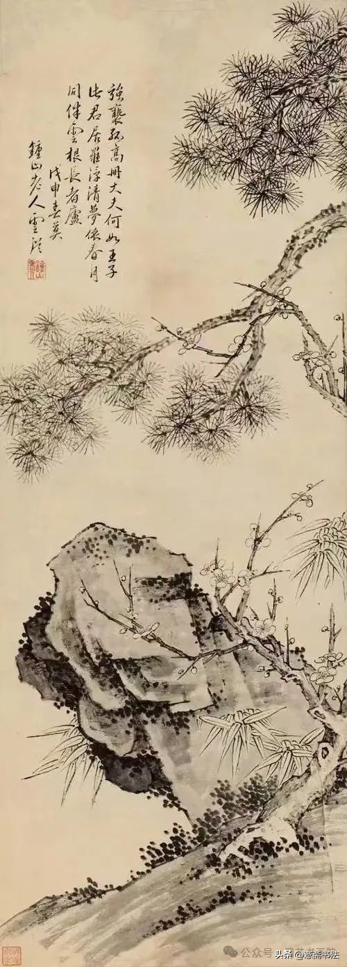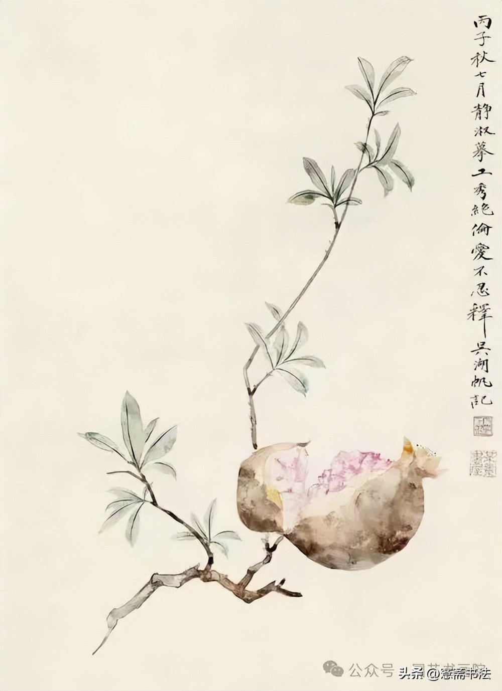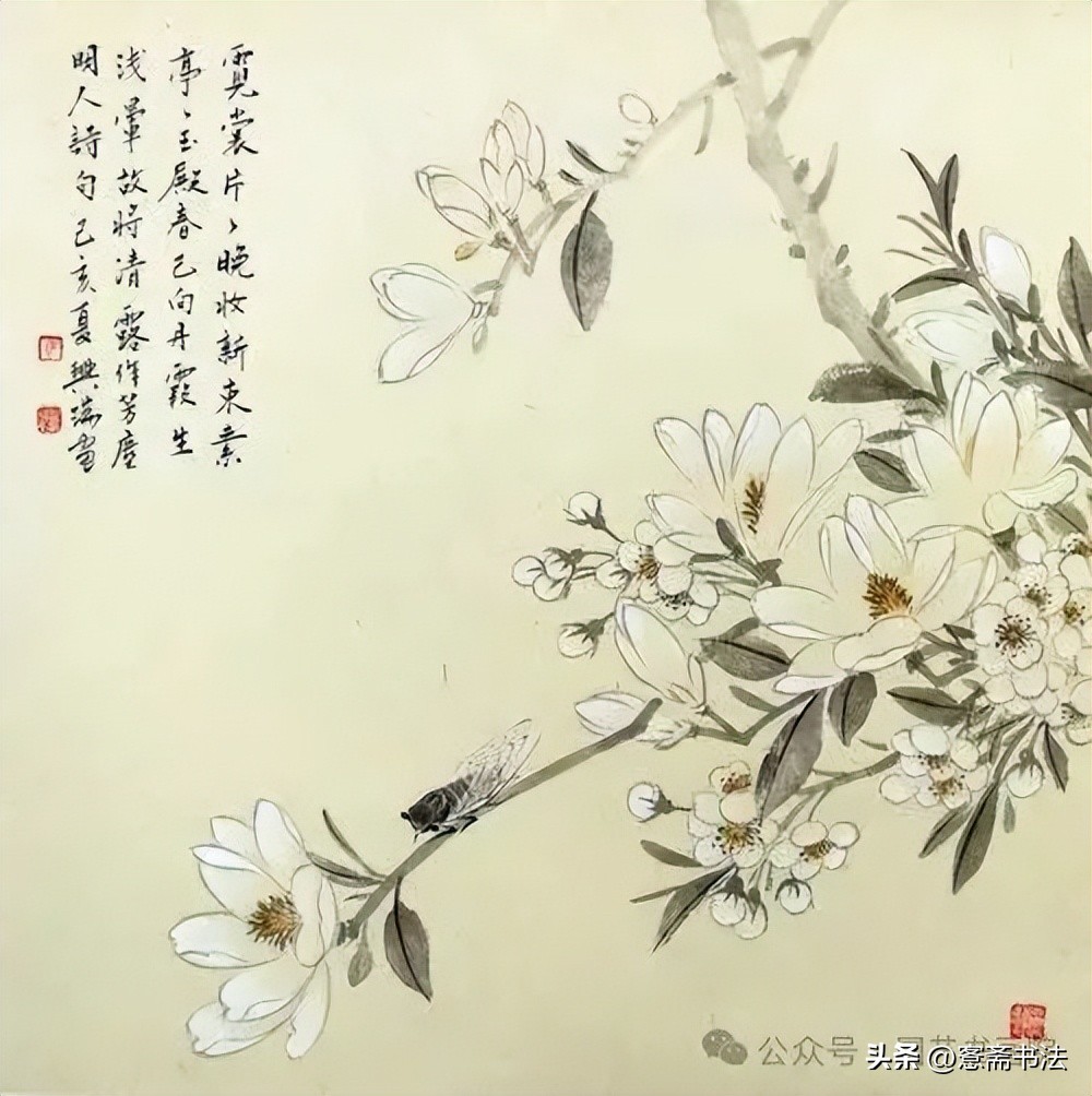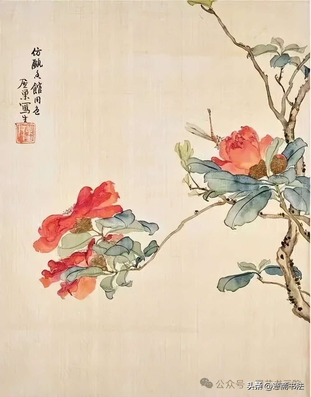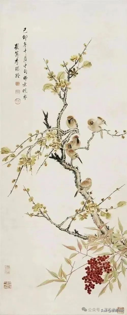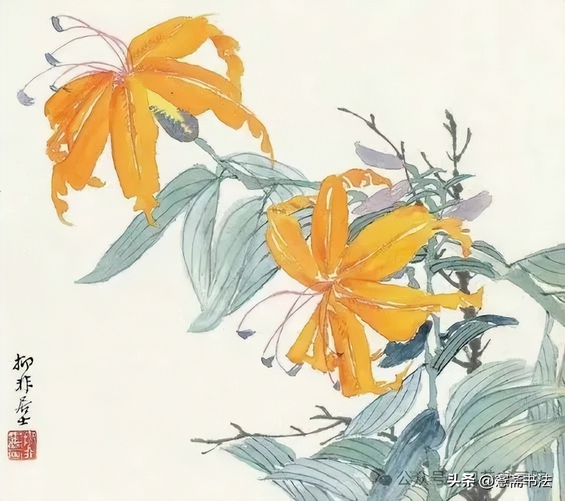 3、以书入画:受到宋元文人写意和明清以书入画绘画思想的影响,近现代花鸟画家注重将书法的用笔融入绘画中,强调笔墨的书写性。通过书法的笔法来表现花鸟的形态,使线条更具韵味和表现力。