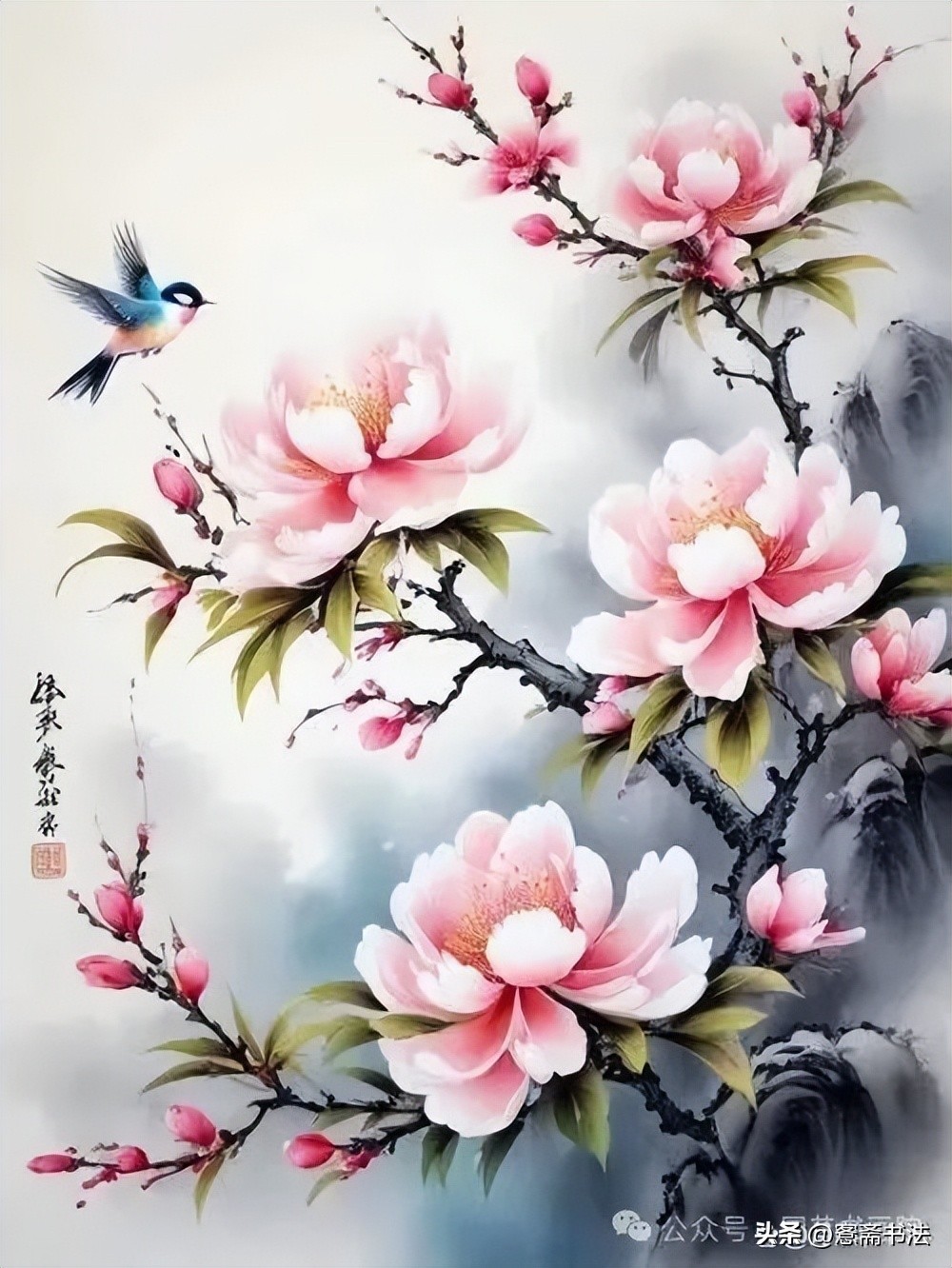 1、传统笔墨的继承:许多近现代花鸟画家仍然重视对传统笔墨的运用。中锋用笔依然是勾勒花鸟形态的重要笔法,能够使线条挺拔有力,展现出花鸟的姿态和结构;侧锋用笔则可用于表现花叶的姿态、羽毛的质感等,使画面更具变化。在墨色方面,依然讲究浓淡干湿的变化,通过墨韵来表现花鸟的神韵。