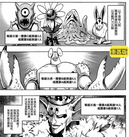 在《一拳超人》中,怪人们根据其威胁程度,自上而下被划分为了神级、龙级、鬼级、虎级、狼级等灾害等级。击败等级越高的怪人,则代表英雄的实力越强。