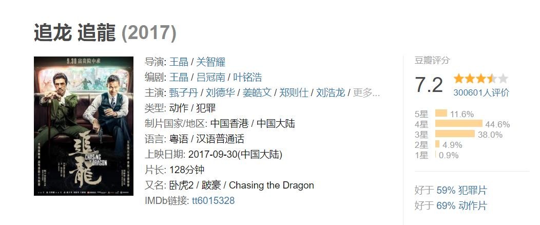 这部片的导演是王晶,王晶的电影大家期望普遍不高,但《金钱帝国》是6.5分,《追龙》也有7.2分,没想到《追虎擒龙》跌到了及格线以下,只有5.6分。
