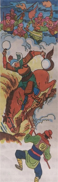 岳飞大怒,举枪便刺。何元庆用锤架住,说若能将他擒住,他就投降说着,两人便大战起来,枪挑锤,好似狻猊舞爪;锤架枪,浑如狮子摇头。战了百来个回合,不分胜负。何元庆架住岳飞的枪,提出明天接着战,岳飞同意,于是各自鸣金收兵。
