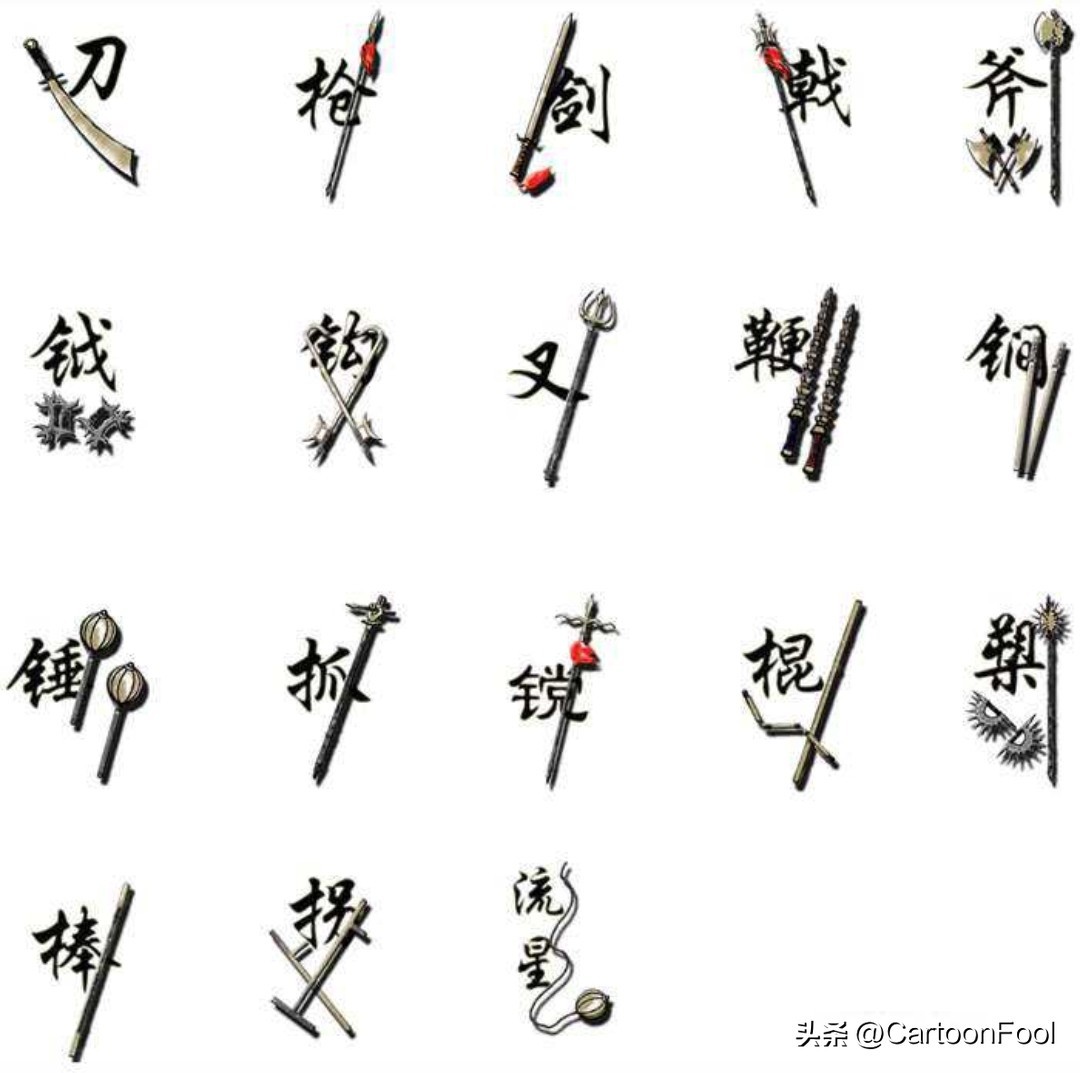传统的十八般武器分别是刀、枪、剑、戟、斧、钺、钩、叉、鞭、锏、锤、戈、镋、棍、槊、棒、矛、耙,跟《铠甲勇士6》中已经公开的都能找到类似的对应。