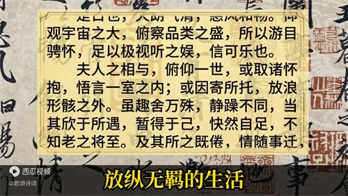 每览昔人兴感之由,若合一契,未尝不临文嗟悼,不能喻之于怀。故列叙时人,录固知一死生为虚诞,齐彭殇为妄作。吊卅殊车巳所以业怀,后之视今,亦犹今之视昔。悲夫,故列叙时人,录其所述。虽世殊事异,所以兴怀其致一也。后之览者,亦将有感于斯文。