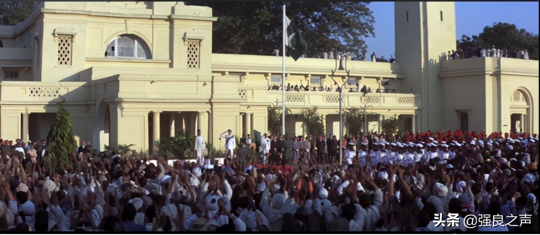 与此同时卡拉奇政府大楼前、真纳和一位英国政府表站在台前,乐队高奏巴基斯坦新国歌,白绿两色加新月图案的巴基斯坦国旗在旗杆上升起,成千上万的人齐声欢呼,巴基斯坦独立了。
