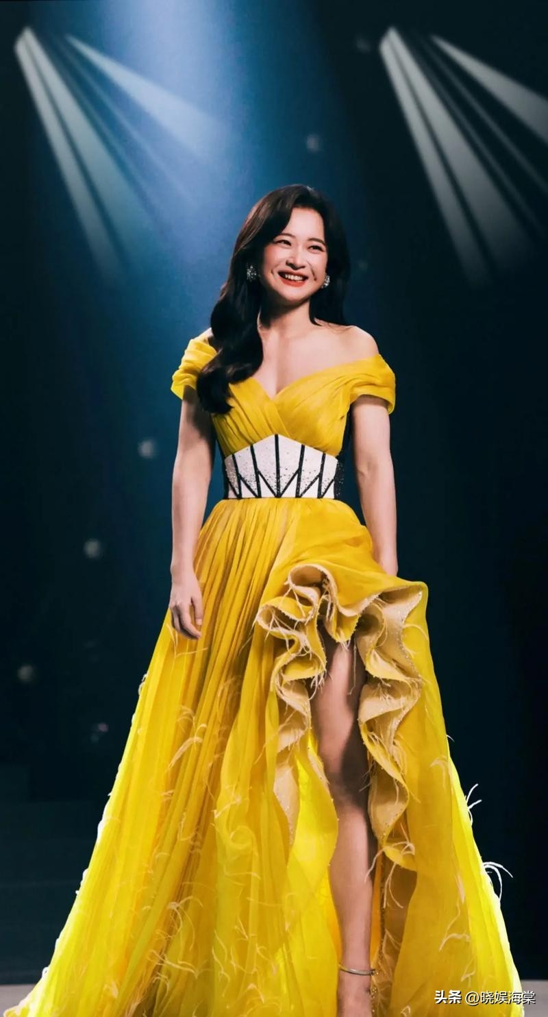 一时间,全网沸腾了,电影上映那天,她穿着黄色长裙站在台上,大波浪卷发衬得脸小了一圈。