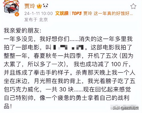 直到2024年1月11日,她在微博扔下重磅炸弹:“为了《热辣滚烫》,我瘦了100斤。”