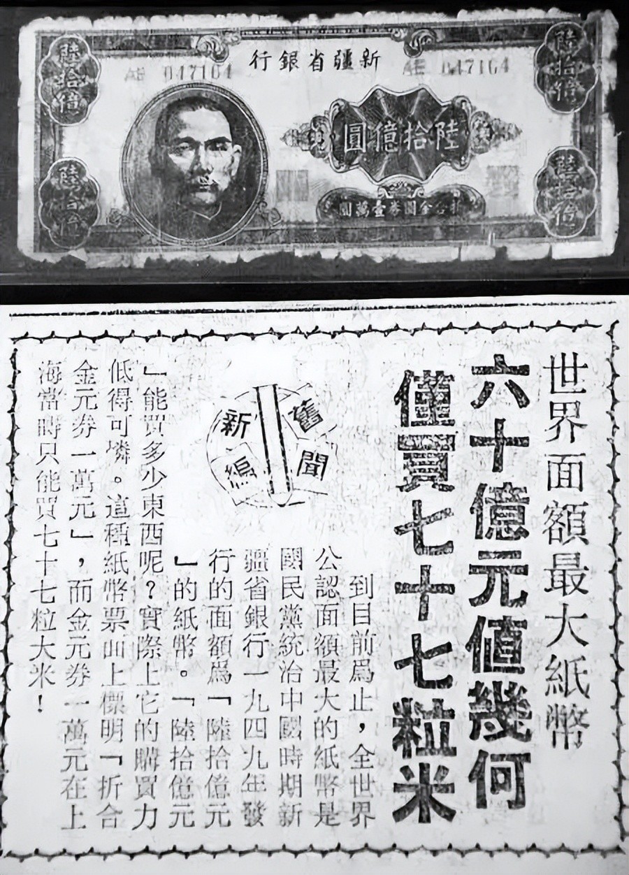 1949年5月10日,新疆省银行发行了中国货币史上钞票面额空前的巨额纸币——60亿元新币,可谓旷古未闻,创世界货币史之最大笑话。仅5月10日至5月29日不到20天的时间里,60亿元面额的新币就发行了288000000亿元!这张60亿元的钞票上印有“折合金圆券壹万元”字样。一张钞票印有两种面值,这在我国货币史上是罕见的。