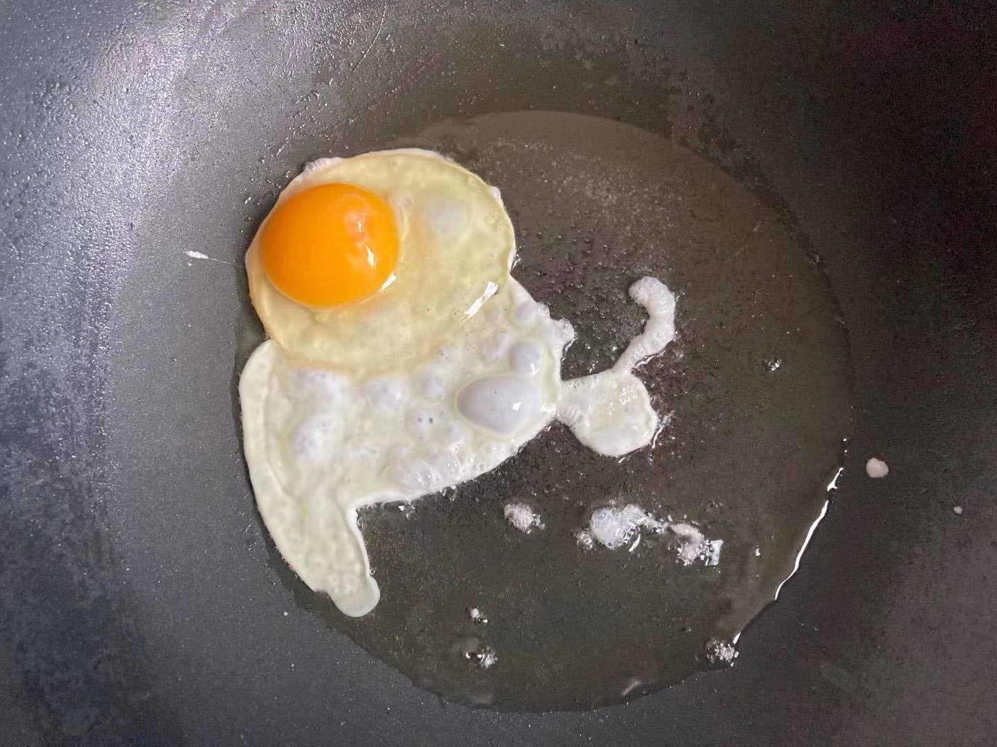 1:所有食材都准备好,锅内放入适量的油和少量食用盐,磕入一个鸡蛋开小火把鸡蛋