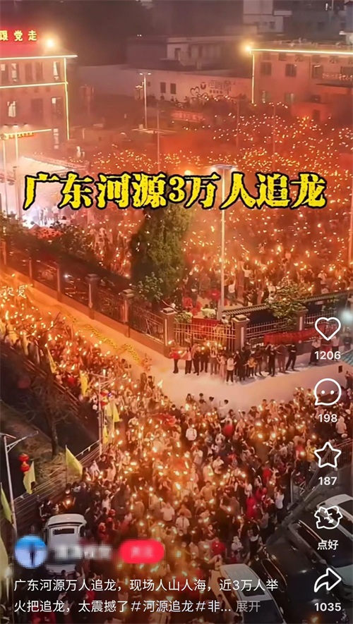 河源市东源县的南园古村“村晚”,听客家山歌、看畲族蓝大将军出巡、品客家糯米酒……客家风味特别“浓”,在网友的小红书记录中,火光簇拥着在乡间小路游走的追龙队,吸引成百上千的游客涌入,500年古村的夜晚沸腾了。