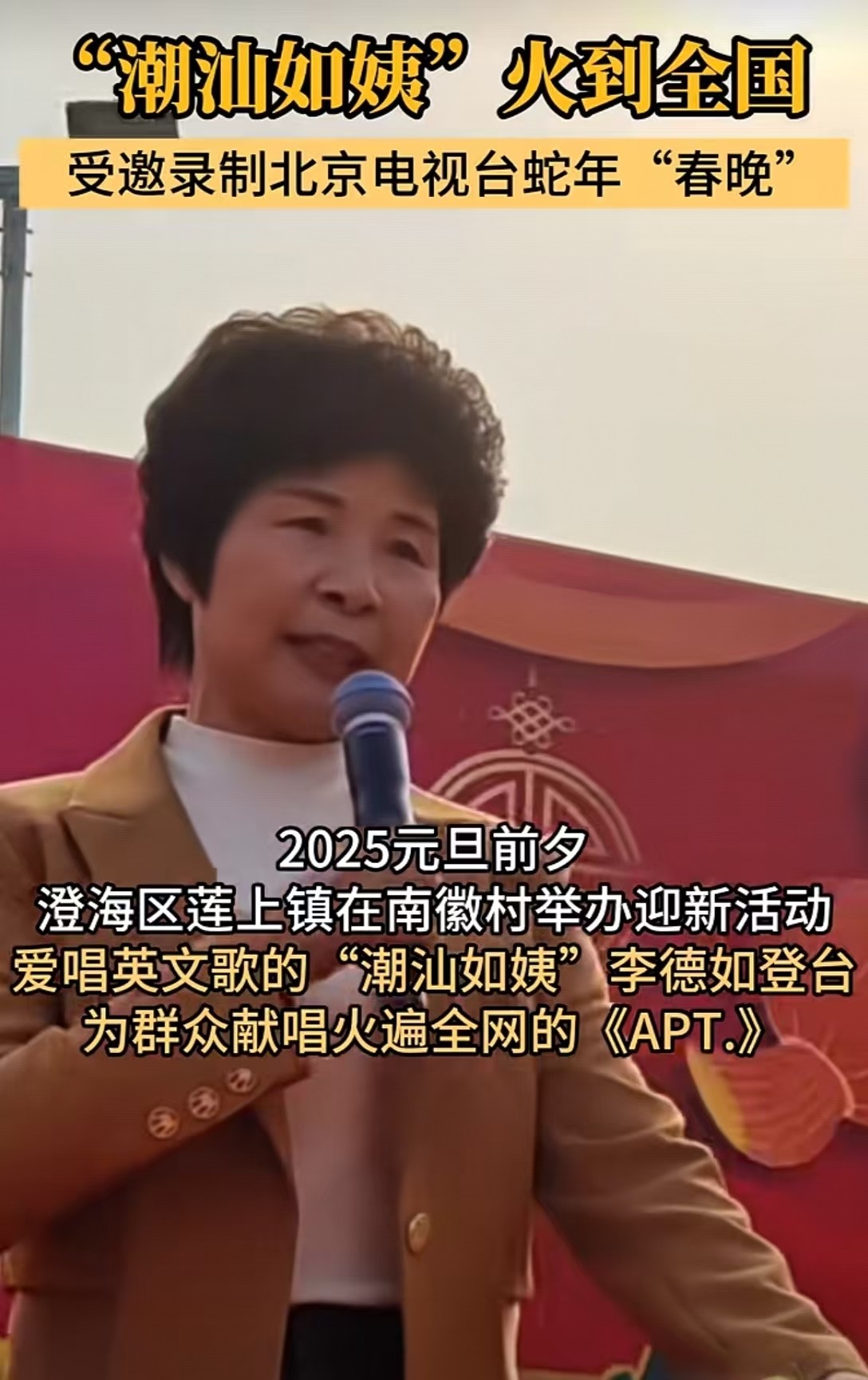 去年5月,凭借英文歌《Sweet but Psycho》的“土味”演唱,汕头市澄海区莲上镇盛洲村的如姨,意外走红全网。她的“初舞台”,就是当地一台“潮”式“村晚”。