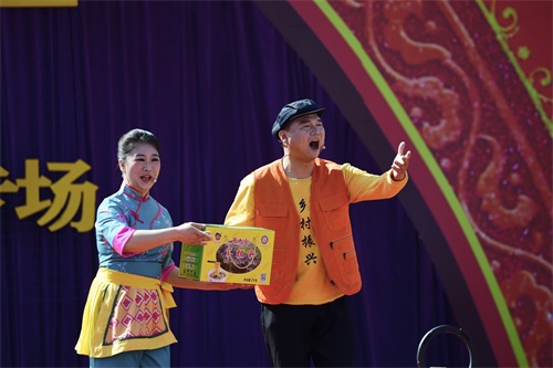 今年的韶关市始兴“村晚”,县里的干部和群众编排的歌舞小品《米粉西施》,在抖音上收获不少点赞。这段俏皮的表演,将村民这一年来直播带货卖“宰相粉”的情景搬上舞台。
