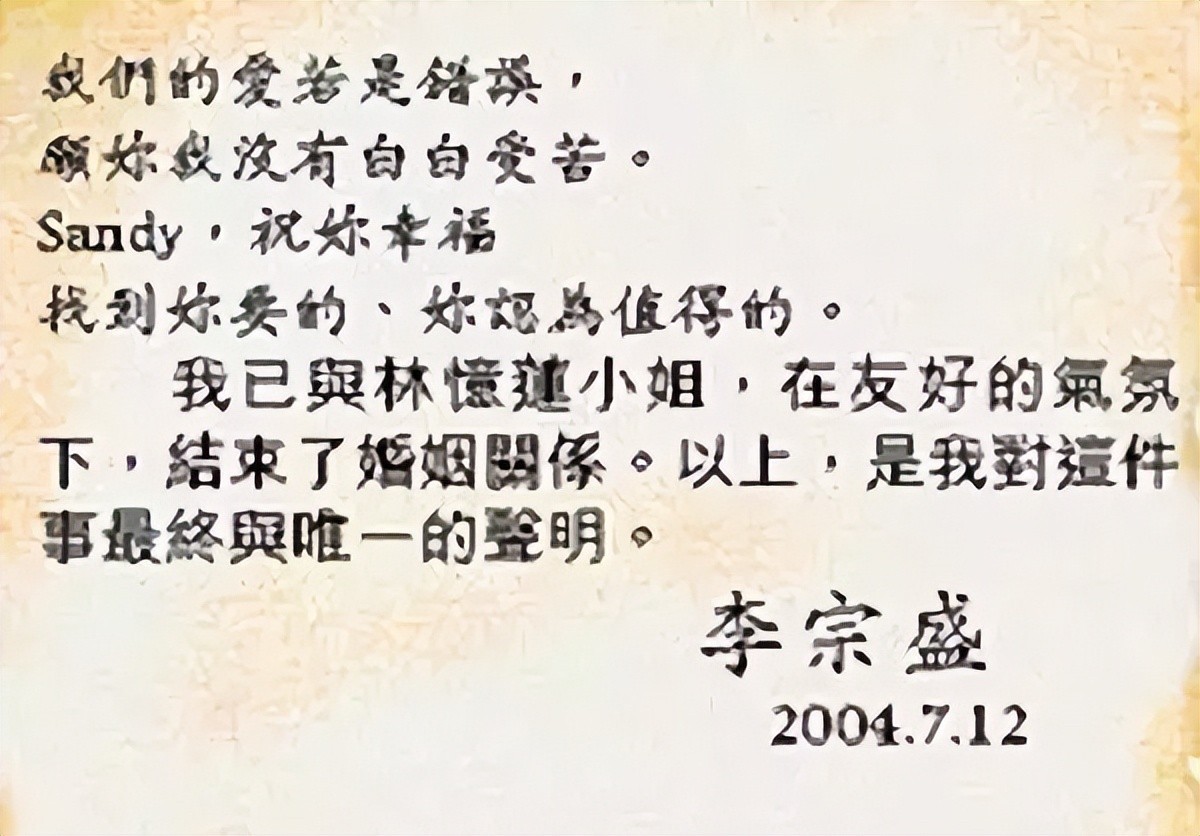 2014年,李宗盛和林忆莲分别发布离婚声明,宣布就此结束6年的婚姻。