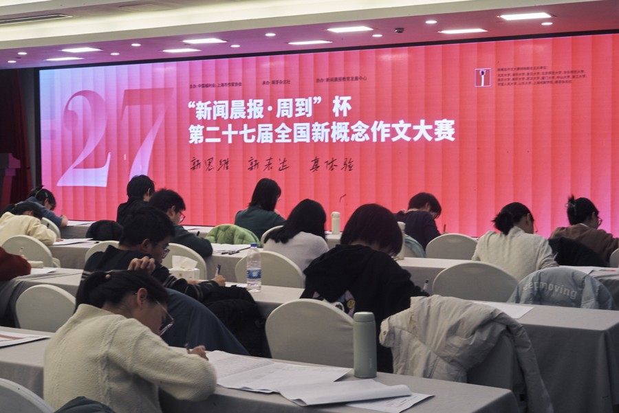“我大学毕业后会给父亲/母亲写封信。以书信体创作”和“你收到一个综艺节目的邀请,来到一个度假小岛。同行的还有另外三个人。你们一直在等待着导演组分配的任务,却发现事情越来越不对劲……以此为故事的开头,写一篇小说”,1月18日下午,来自全国各地的“新闻晨报·周到”杯第二十七届全国新概念作文大赛复赛入围选手,在考场里收到了这两道现场创作题,参加限时三小时的创作。