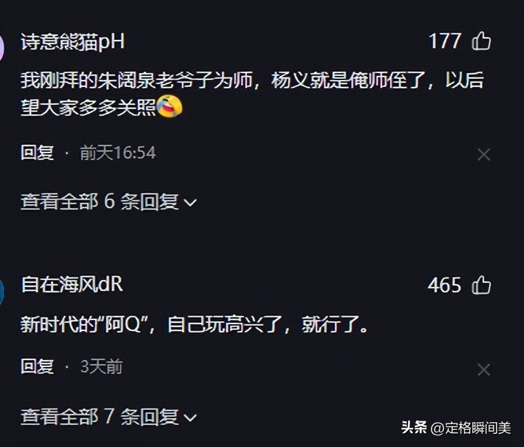 杨议和侯耀华自述:“没想到杨议拜师会引起这么大反响,这么多阻碍,真的是天难了···”。之所以有这么大的阻力,不少网友认为,杨议在经历“七月风波”后人设崩塌,尤其是被爆出婚内生子等负面事件,被部分人认为道德有亏,且莫名“砸缸”的一些言论和行为被指反复无常,炒作没底线。
