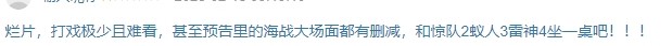 “烂片,打戏极少且难看,甚至预告里的海战大场面都有删减,和《惊队2》《蚁人3》《雷神4》坐一边吧!”