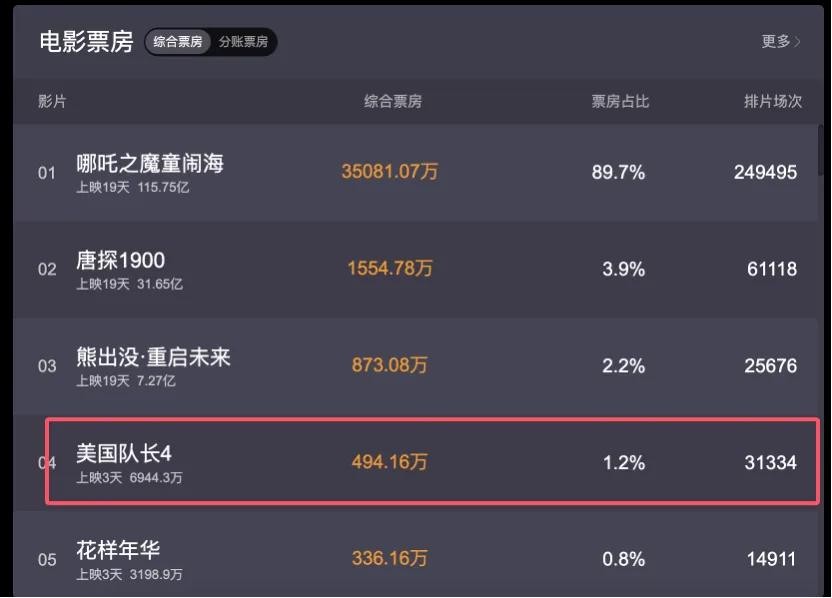 这个时候影片《美国队长4》在情人节上映,要跟《哪吒2》正面硬刚,结局毫无意外它输得惨不忍睹。