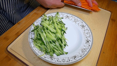 8.接着准备一些自己喜欢的配菜,像黄瓜丝、胡萝卜丝、绿豆芽等都可以。