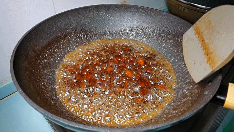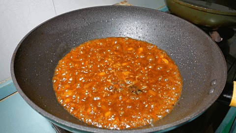 5.把肉丁炒出油脂,并切成焦黄色后淋入准备好的酱汁。