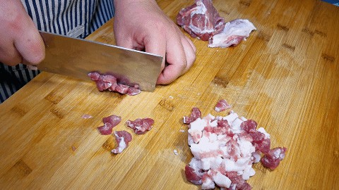 1.猪肉一块,把肥肉和瘦肉部分切开,先切长条再把猪肉切成肉丁。