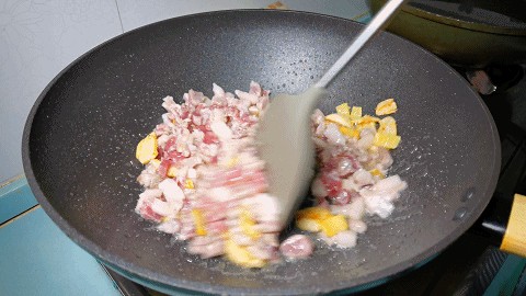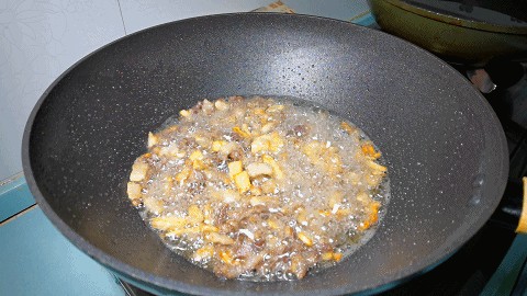 4.炒锅烧热淋入少许植物油,油热下入蒜末和姜片煸香,再下入肉丁,沿锅边淋入5克料酒,把肉丁多煸炒一会,一直炒出肥肉的油脂。