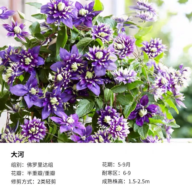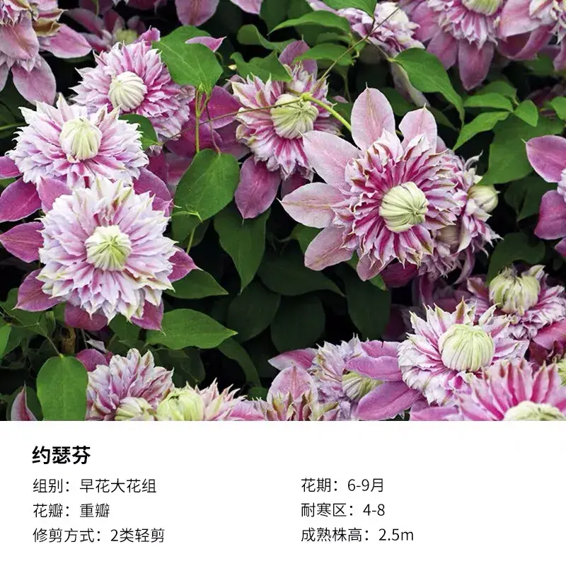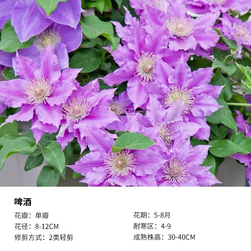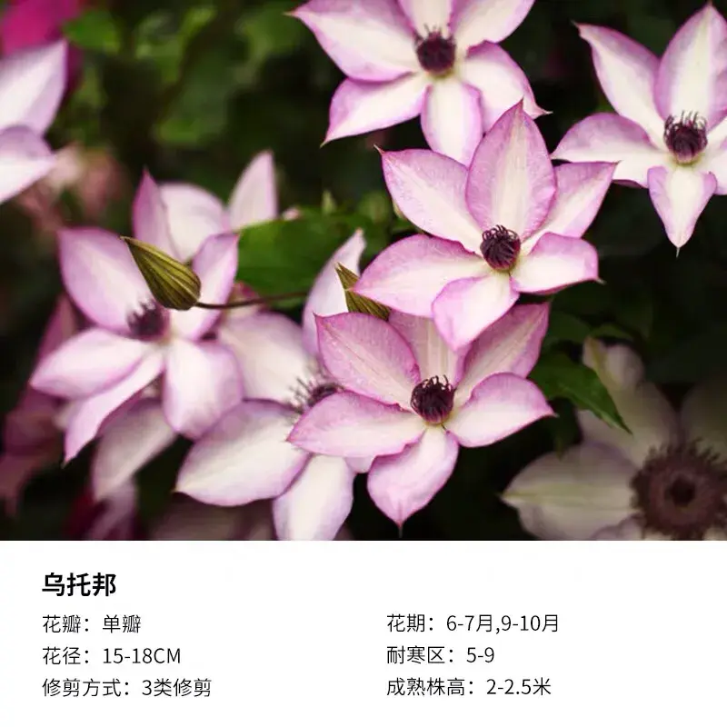F系铁线莲,花特别多,且比较耐热,能够耐40℃的高温,对光照要求比较低,适合阳台、飘窗。乌托邦可以在初秋时进行重剪促发新枝。