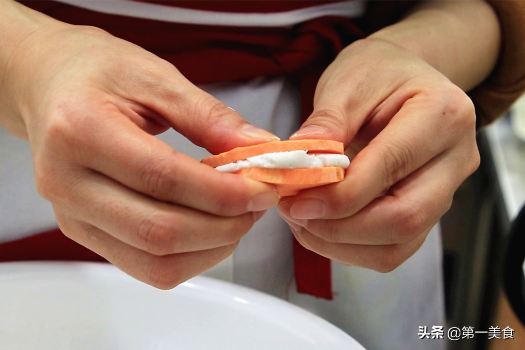 4.取一小块糯米面,搓一搓、再压成和红薯片相同大小的面饼,用两面红薯夹住,摁压一下做成红薯糯米饼,依次把所有的饼都做好。