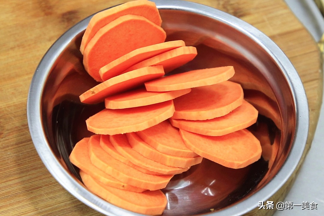1.首先,我们准备一个红薯,削去外皮后切成片,硬币的厚度即可。