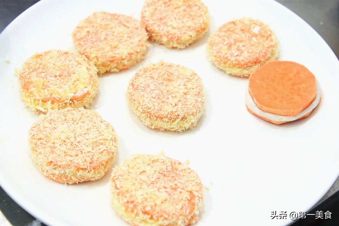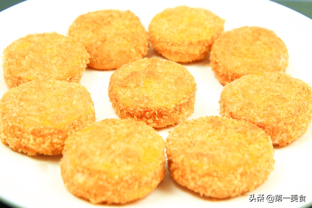 5.然后我们把做好的糯米饼裹一层面粉、蘸上蛋液、再裹一层面包糠,准备炸制。