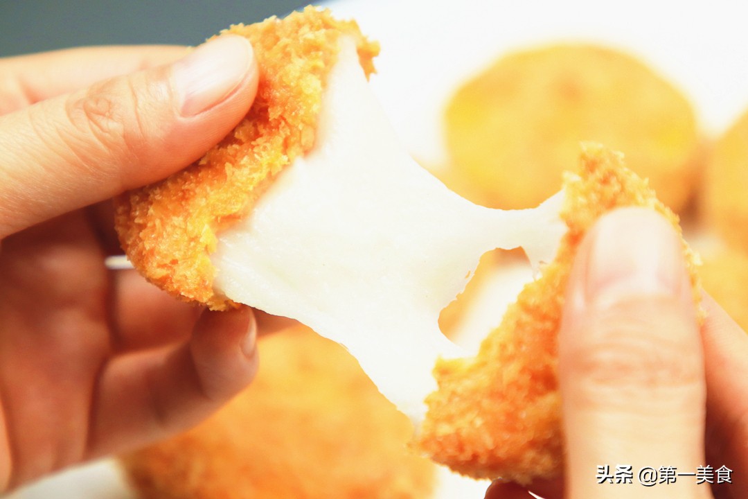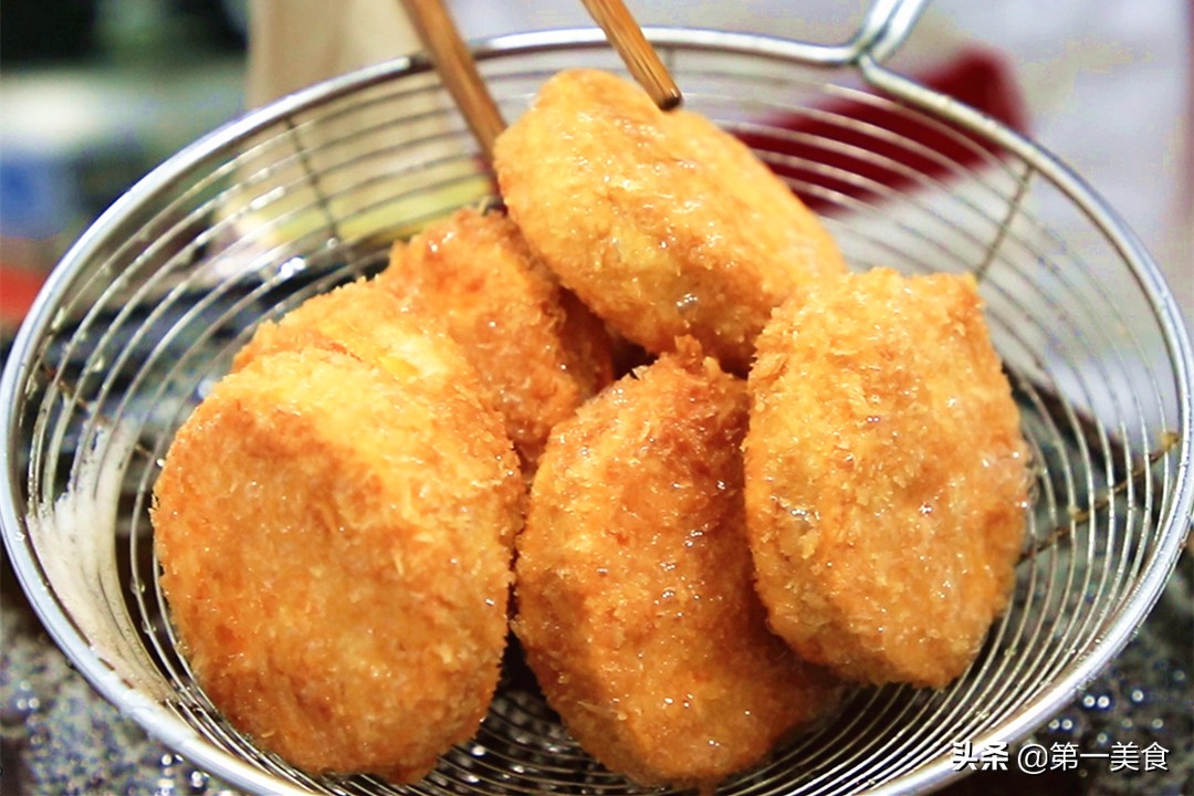 6.锅内烧油,油温4成热时放入糯米饼,开小火慢慢炸,糯米饼炸成金黄色、全部飘起来就熟了,捞出来控一下即可食用。因为裹了面包糠,糯米饼外层非常的香酥,内里香甜软糯、简直能拉丝,特别的好吃。