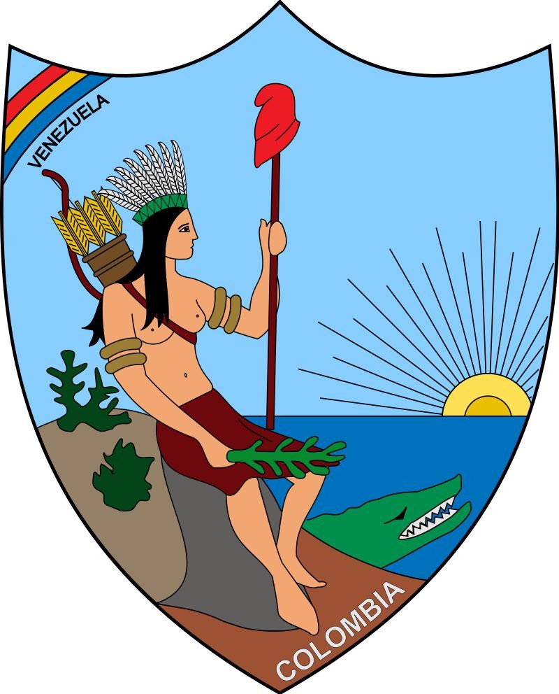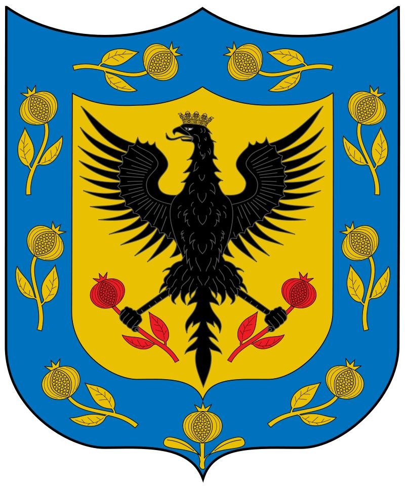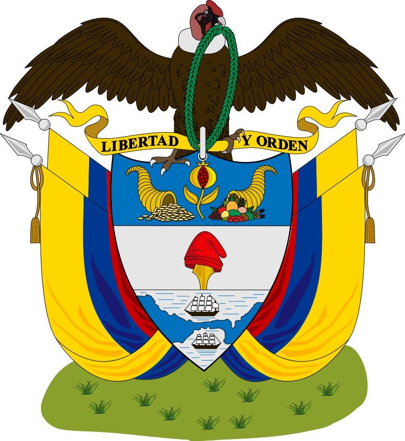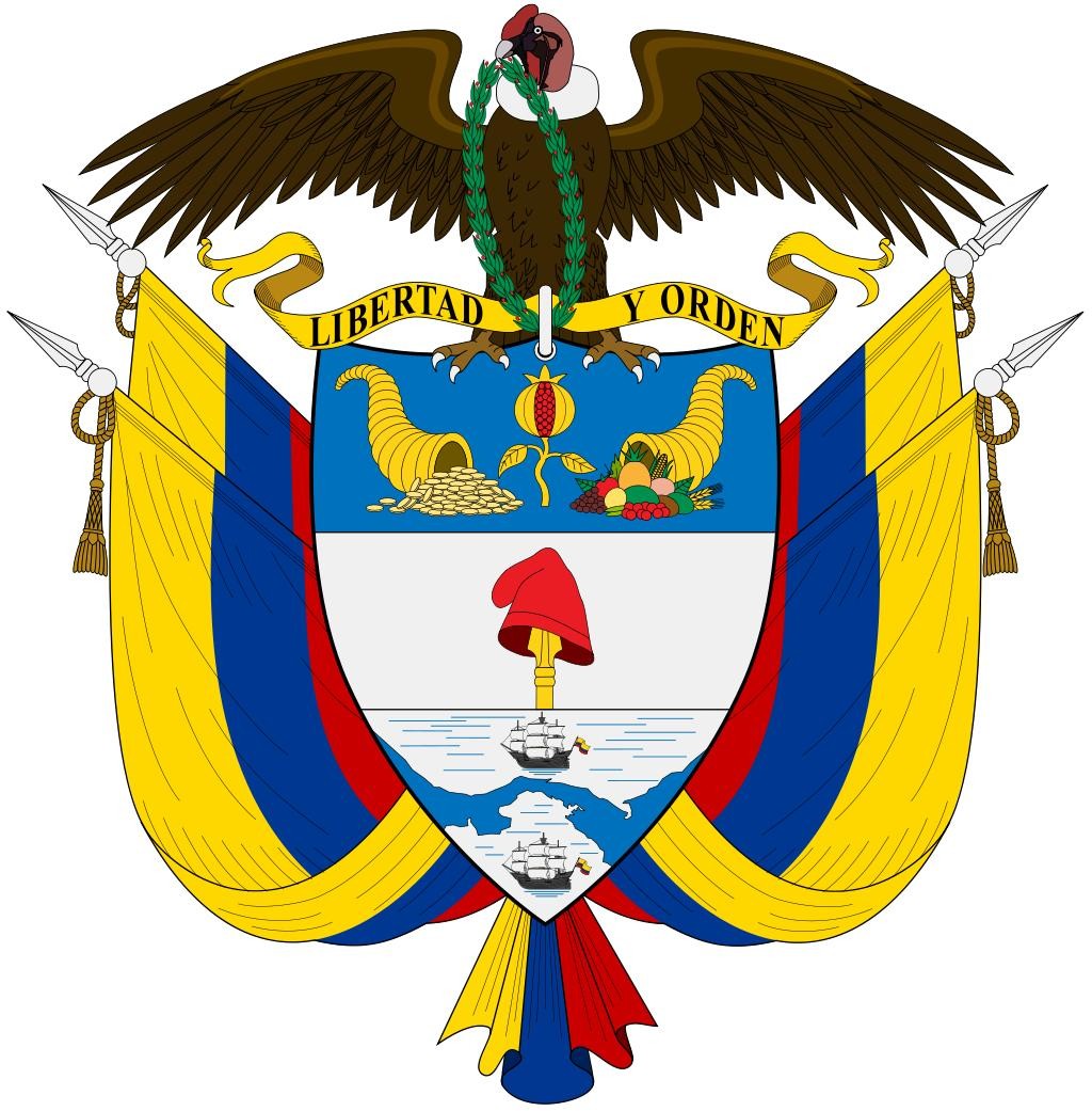 国徽为一盾徽,分为上中下三部分:上方为石榴(哥伦比亚是原本新格拉纳达的一部分)和两只丰裕之角。中间是被矛挑起的自由之帽。下方图案表示哥伦比亚位于太平洋与大西洋之间。盾上方有一振翅、咀叼月桂枝条的安第斯神鹰,爪下的绶带书有国家格言“自由与秩序”。两侧有四面国旗枝条装饰。