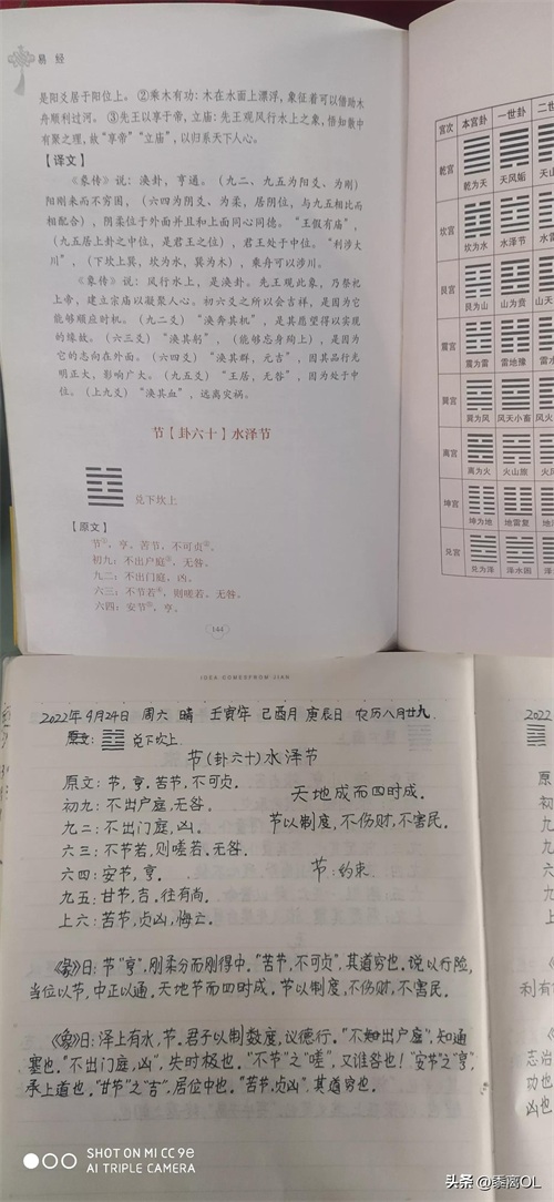 【题解】:坎为酒食,兑为口,就食之象,即之字也。《说文》云:“即,就食也。”震为竹,竹之有即,是節之字也。先天坎居西方,后天兑值正秋,信守合约,是节之名也。坎水也,兑泽也,震动也,艮止也,水入泽中而止其动,是节之象也。坎性也,艮欲也,兑情也,震发也,艮止也,七情六欲发而有制,亦节之象也。《诗》云:“哀哉为犹,匪先民是程,匪大犹是经。”是失节之辞也。是故节者,竹约也,虎符也,裁制也,贞操也,节省也,法度也,约束也,和乐也。