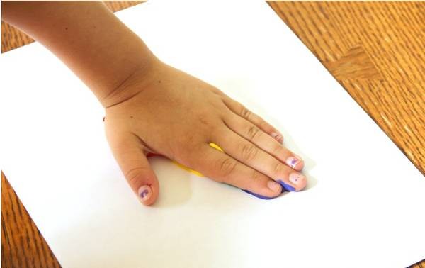 2、让孩子把手,倾斜着印在白纸上。