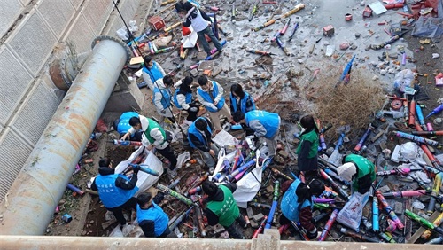 在山西吕梁交城县,正月初五这天,当地的志愿者创下了纪录。据交城县生态环境保护志愿者协会负责人张晋介绍,以学生群体为主的两百多位志愿者踩到结冰的磁窑河面上,足足清理出近一吨的垃圾,既包括烟花垃圾,也有水瓶、编织袋等生活垃圾。以至于团队向交城县住建局协调来一台吊车,才将大袋的垃圾运出河面。