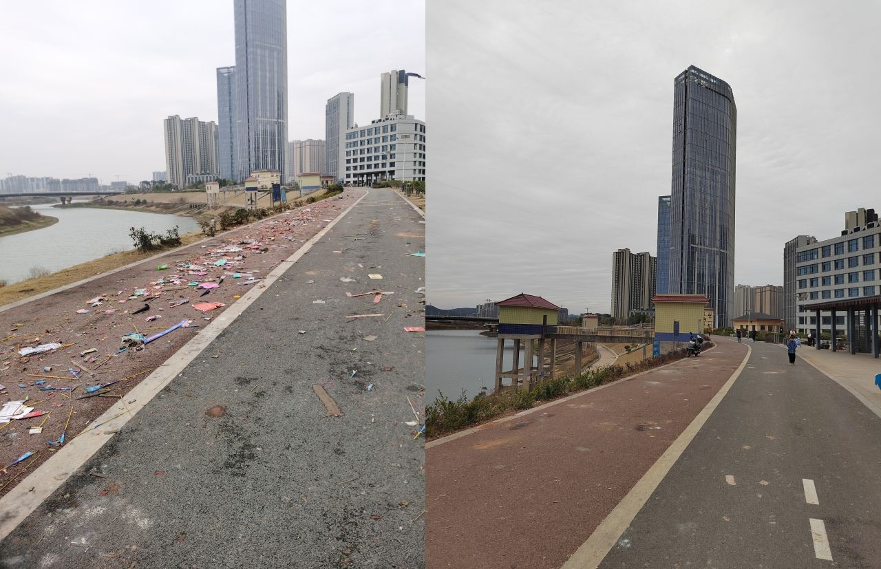 长沙靳江河岸,烟花垃圾经志愿者清扫前后的对比图。受访者/图