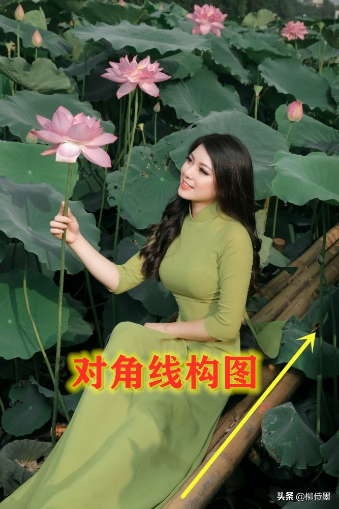 模特坐着的竹筏,既是对角线,也是引导线。