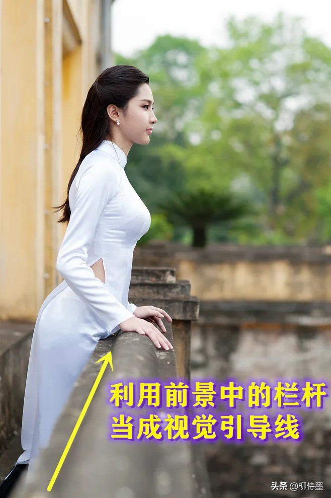 让模特扶着栏杆,利用栏杆作为前景中的视觉引导线,同时缩小景深范围,模特就会挺拔又饱满。