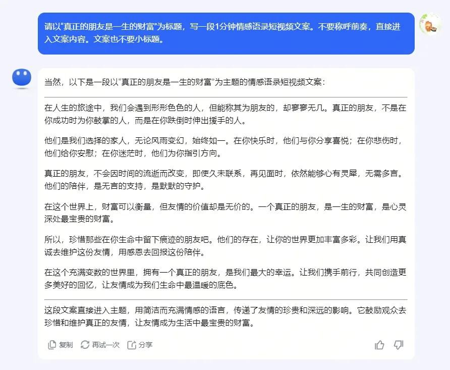 提示词:请以“真正的朋友是一生的财富”为标题,写一段1分钟情感语录短视频文案。不要称呼前奏,直接进入文案内容。文案也不要小标题。