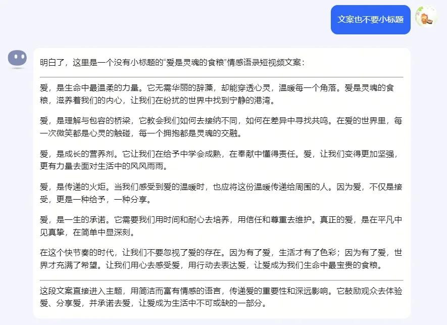 到这里,试出了适合锅头需求的提示词,之后只需要基于当前最受欢迎的情感主题,更改标题名称,按上面的提示词内容问Kimi就能得到满足剪映图文成片要求的情感语录文案。